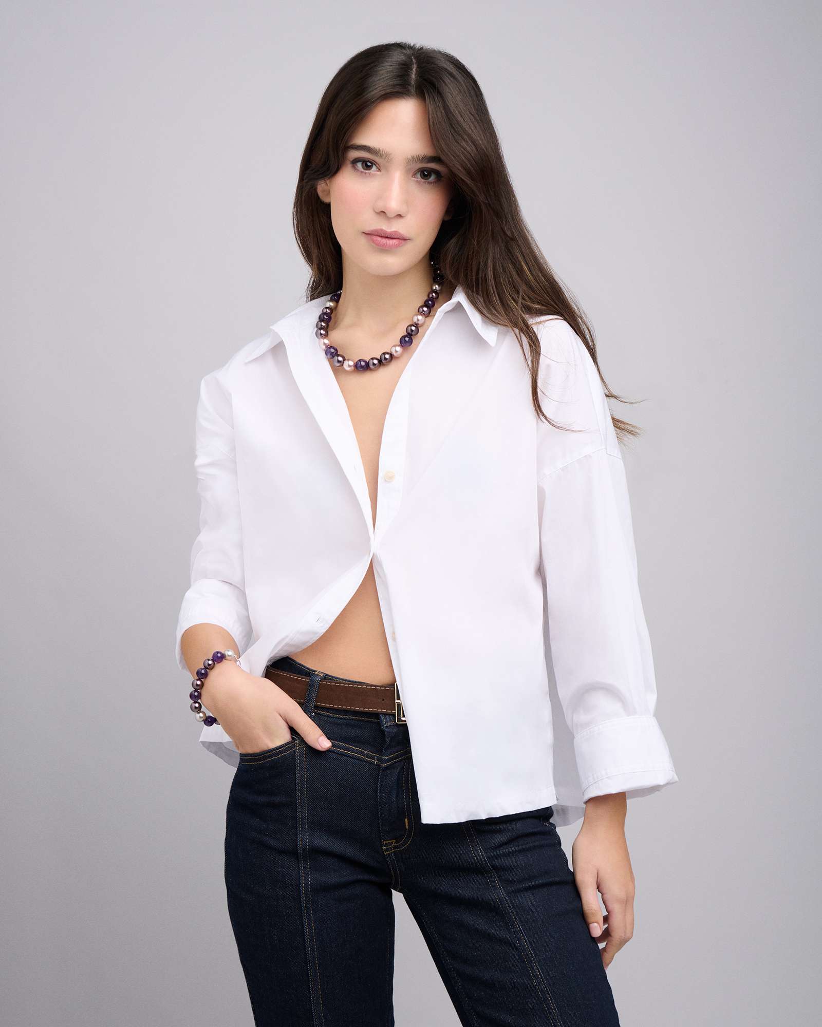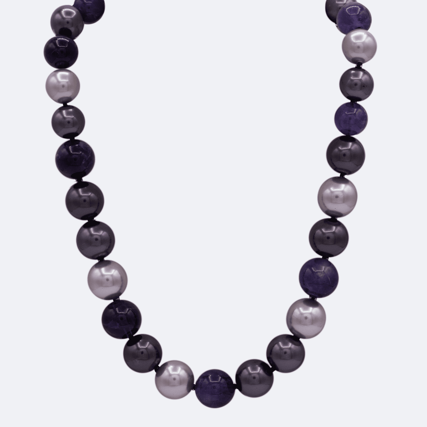 Collar amatista con perlas en tonos malvas, bronce y gris.