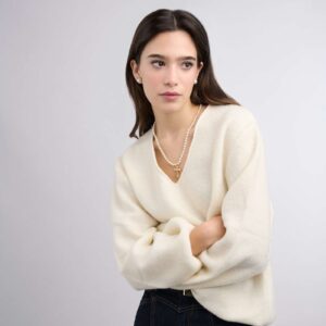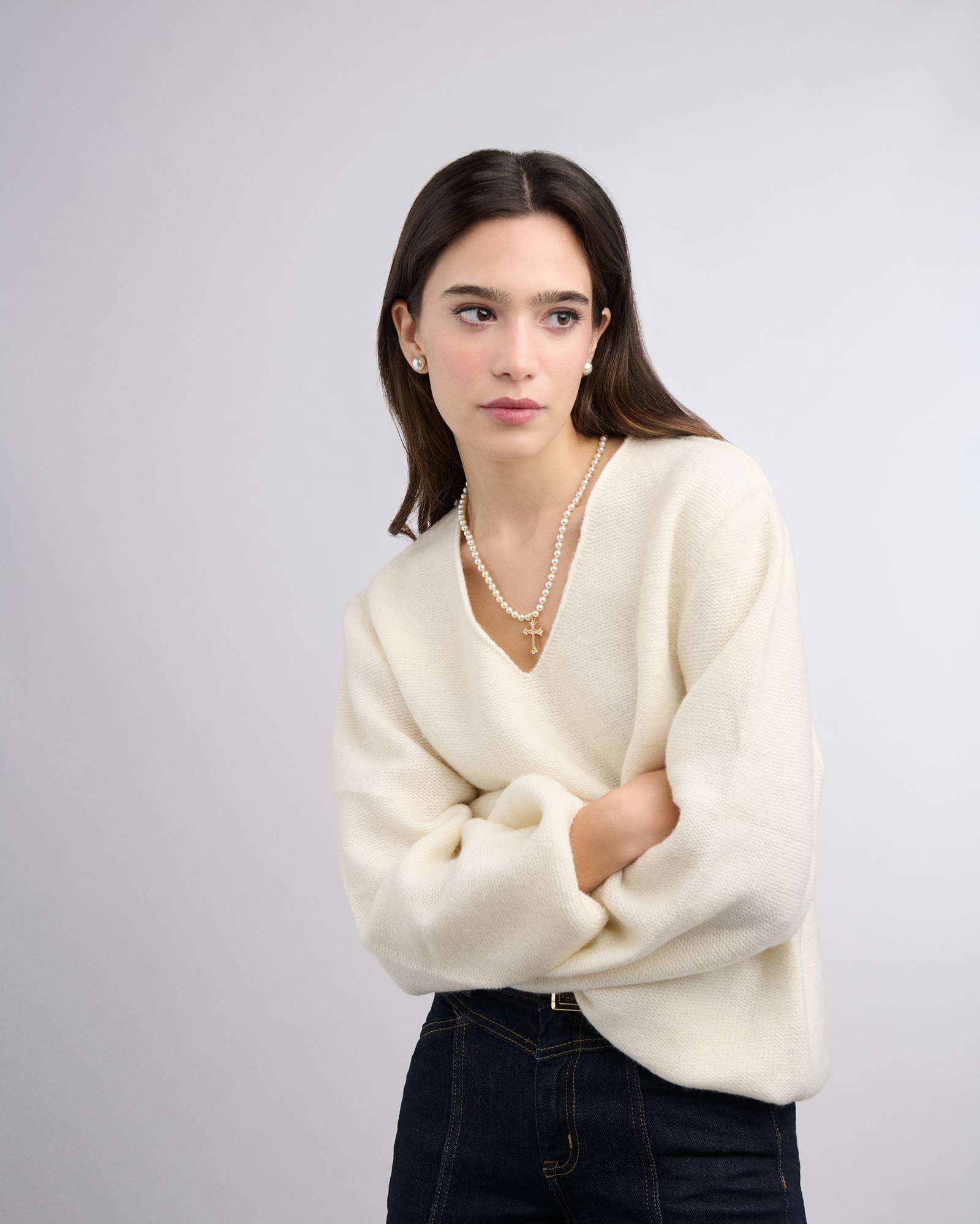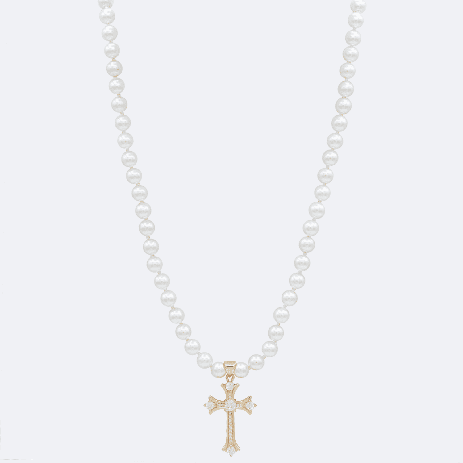 Collar perlas esféricas blancas de 6mm con colgante de cruz. Bañado en oro con circonitas blancas.