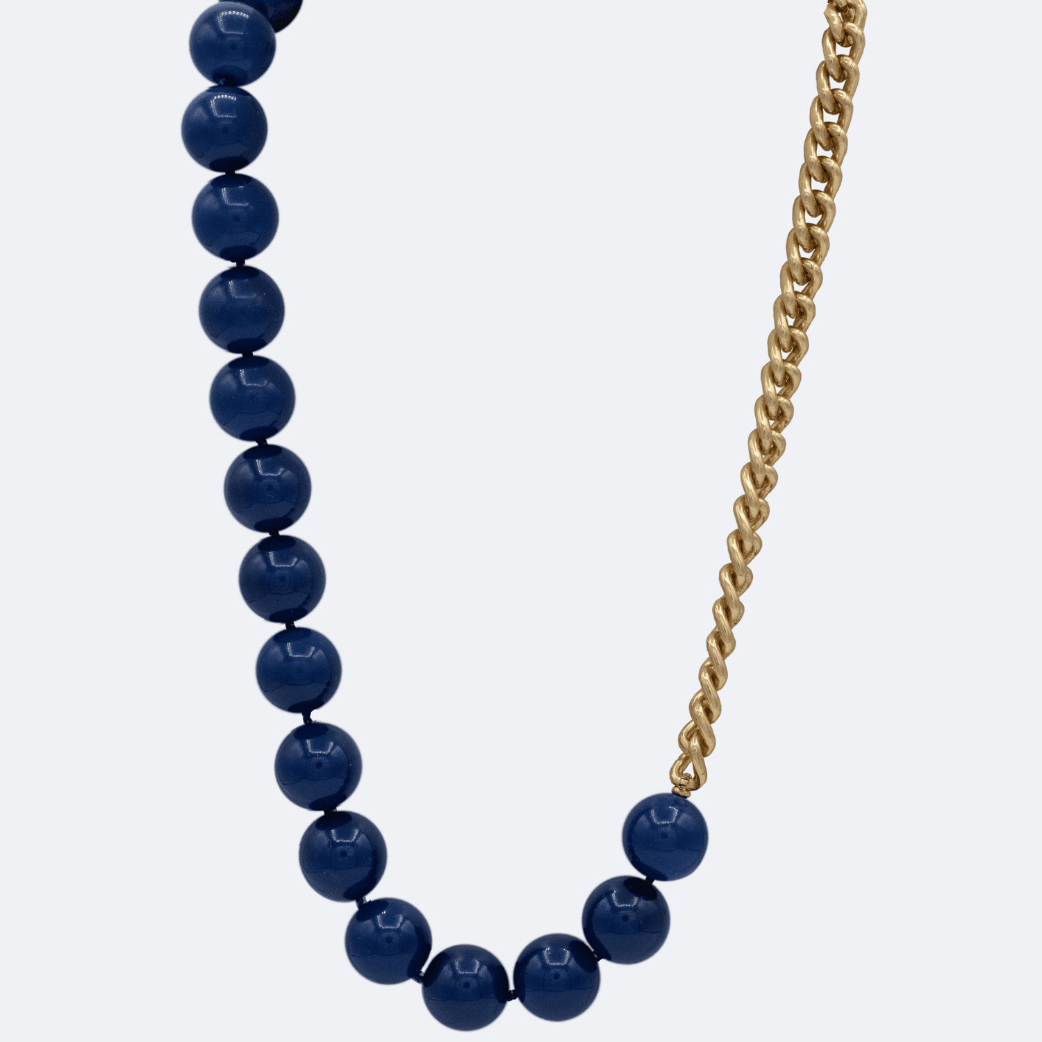 Collar en perla azul con detalle de cadena. Bañado en oro.
