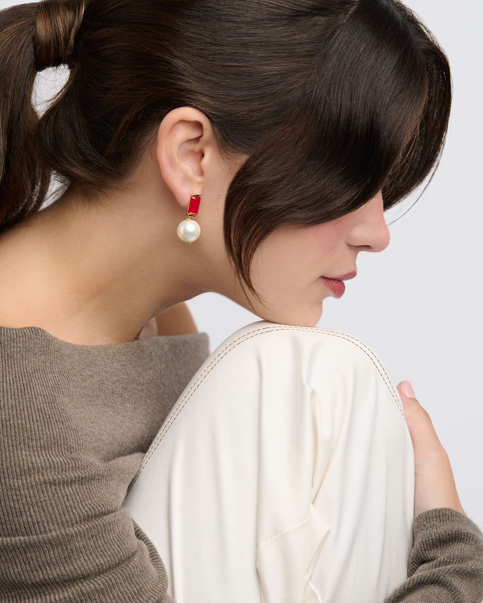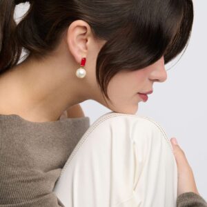 Pendiente tuyo con cabujón plano de jade rojo y perla blanca. 12 mm. Bañado en oro. Cierre presión.