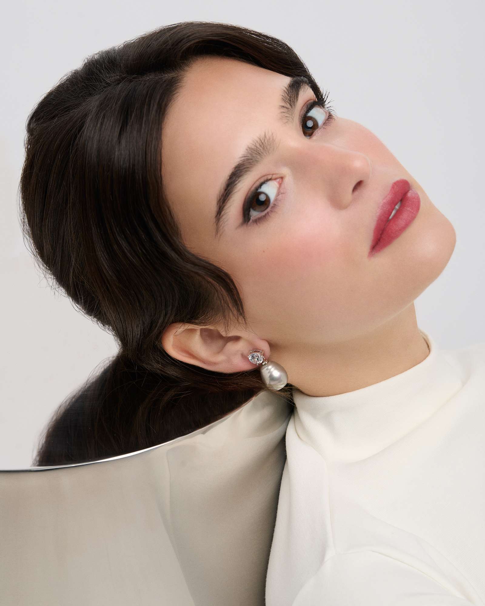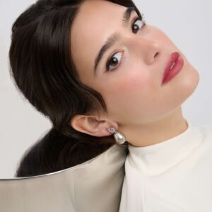 Pendiente tuyo con circonita talla brillante blanca de 8mm y perla barroca gris. Bañado en rodio. Cierre presión.
