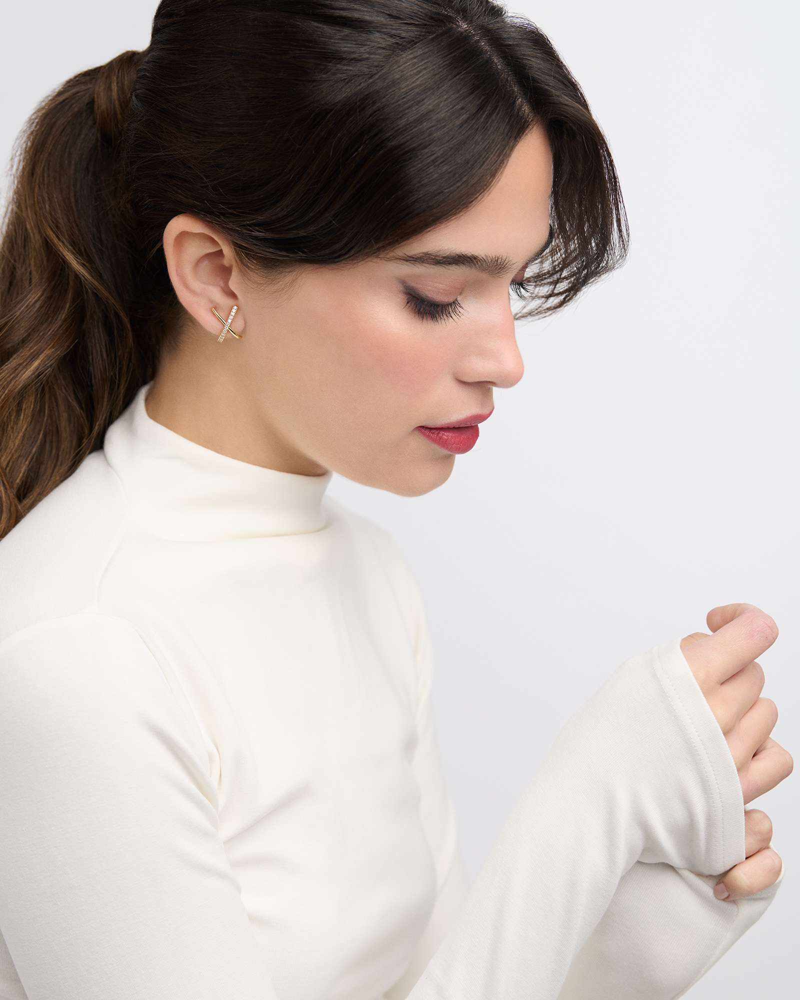 Pendiente X dorado con circonitas blancas. Bañado en oro amarillo y cierre presión.