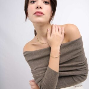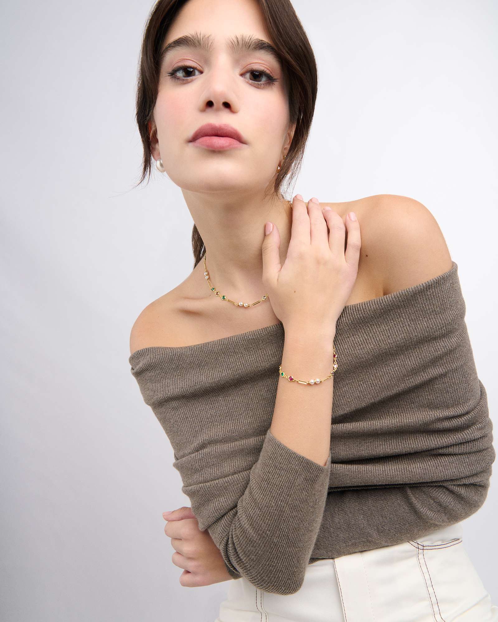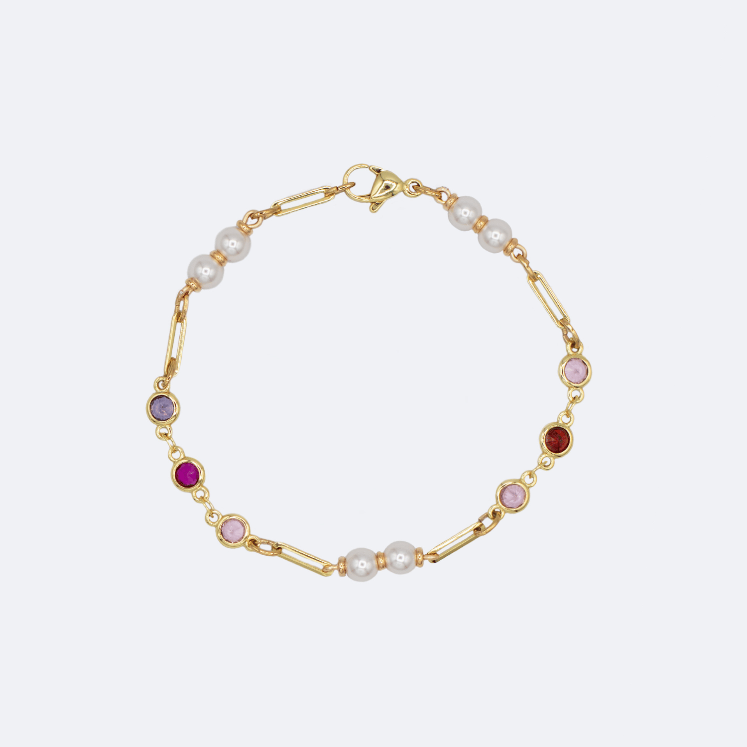 Pulsera cadena dorada de eslabones y cristales tres tonos. Cierre tipo mosquetón.